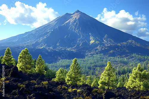 © Eos, Fototapeta premium Volcanic Mountain Peak With Pine Trees