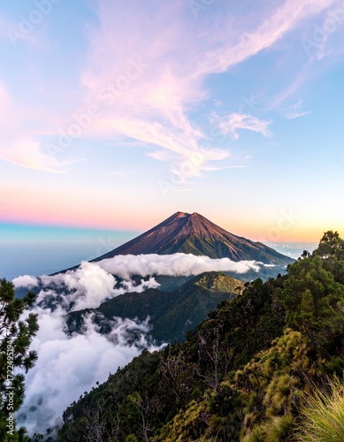 Fototapeta premium Volcanic peak at sunset, clouds