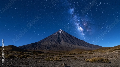 Fototapeta premium Volcanic peak, Milky Way, night sky, desert landscape, astronomy