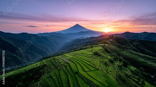 Fototapeta premium Volcanic Sunrise Over Rice Terraces - Serene sunrise paints the sky vibrant hues, illuminating lush green rice terraces clinging to volcanic slopes. Symbolism: peace, abundance, nature's beauty