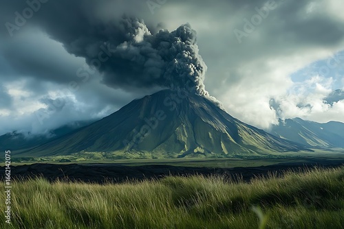 Fototapeta premium Volcano erupting with smoke billowing above, green grass on foreground and...