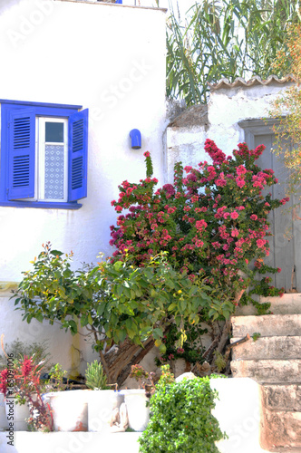© JeanLuc, Obraz premium Volets bleus sur mur blanc