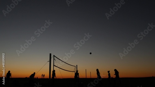 © Dogora Sun, Fototapeta premium Volleyball net silhouette on beach sport court at sunset, people playing on California coast, USA. Sport field for volley ball game players by ocean shore. Twilight sky of Mission beach, San Diego.