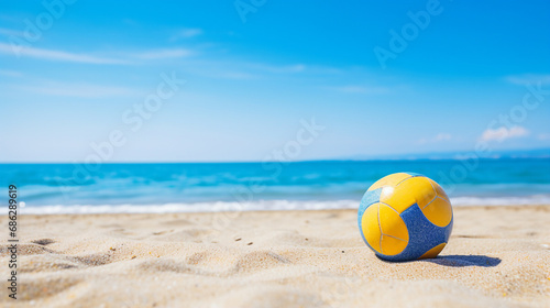 Naklejka premium Volleyball on a sunny beach with clear blue skies in the background.
