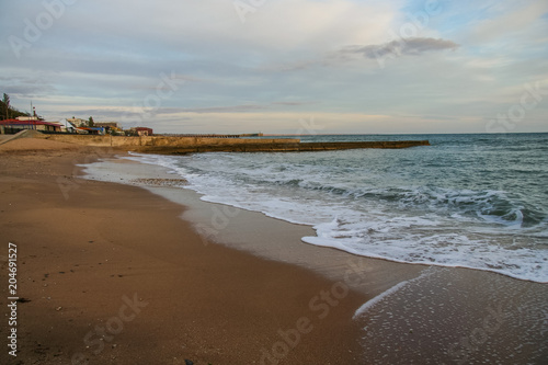 Fototapeta premium Volnorez on the beach in the village of Primorsky