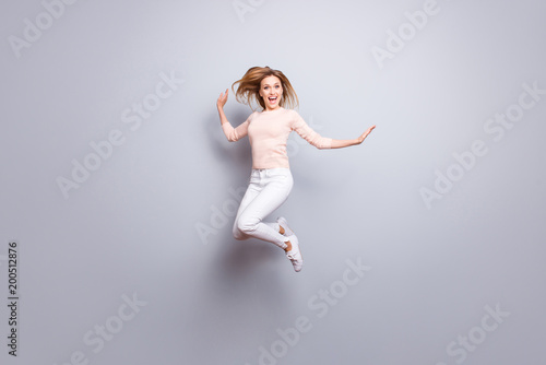 Fototapeta premium Volume careless leisure lifestyle casual white rejoice concept. Full-length...