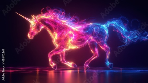 © peppastocker, Fototapeta premium Volumetric figure of a unicorn with glowing neon outline. The hoofed mythical animal is running fast. Illustration for cover, card, postcard, interior design, banner, poster, brochure or presentation