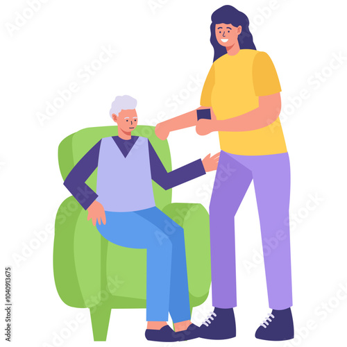 © Denu, Fototapeta premium Volunteer Character Helping Elderly Isolated on White Background. Vector Illustration