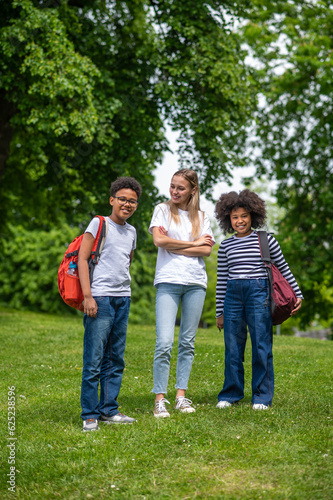 © zinkevych, Obraz premium Volunteer spending time with kids and all looking happy