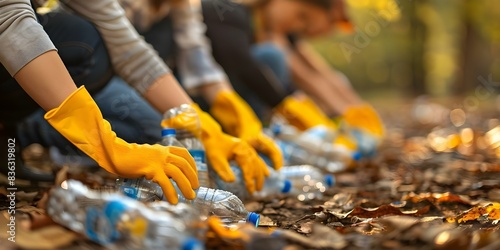© Anastasiia, Obraz premium Volunteers in yellow gloves collect plastic bottles during outdoor cleanup. Concept Environmental Conservation, Community Service, Recycling, Outdoor Activities, Teamwork