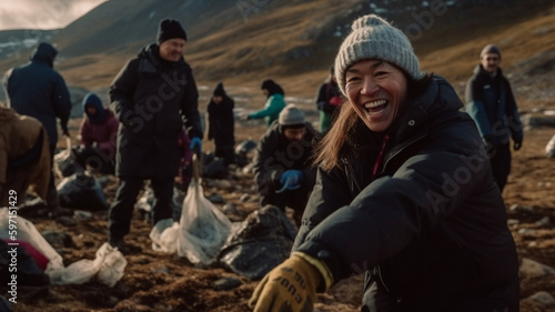 © Forest Tiny House, Fototapeta premium Volunteers picking up trash on the beach. Ecology concept. Ai generative