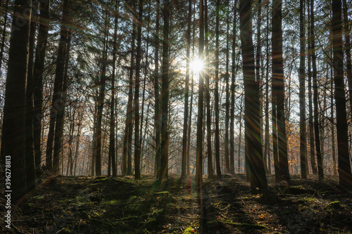 © Stefan, Naklejka premium Von der Sonne durchfluteter Nadelwald mit moosigem Vordergrund.