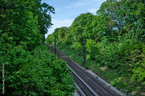 © Kostas Koufogiorgos, Fototapeta premium Von Laubbäumen gesäumte Bahngleise