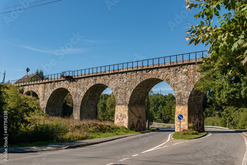 Fototapeta premium Vorokhta, Ukraine – September 24, 2021: A big, old, ancient aqueduct bridge...