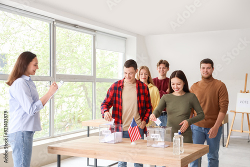 Fototapeta premium Voting young people with USA flag near ballot boxes at polling station