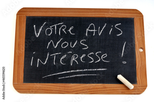 © Richard Villalon, Fototapeta premium Votre avis nous intéresse écrit sur une ardoise d'école à la craie