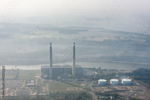Obraz premium vue aériennes cheminées de l'usine thermique de Porcheville dans les Yvelines...