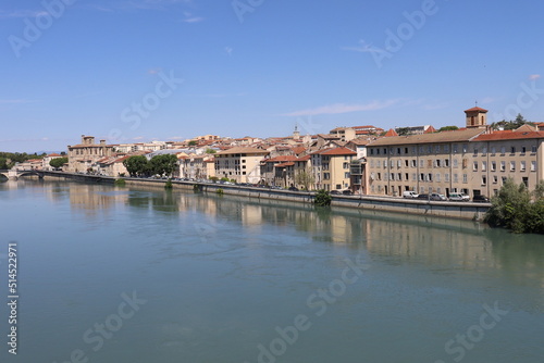 © ERIC, Fototapeta premium Vue d'ensemble de Romans le long de la rivière Isère, ville de Romans sur Isère, département de la Drôme, France