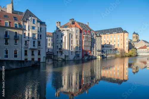 Naklejka premium vue du centre ville de Metz, au bord de la Moselle à proximité du petit port de plaisance reflet des bâtiment dans l'eau