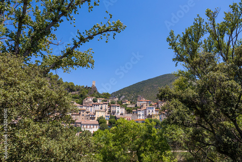 Obraz premium Vue estivale sur le village de Roquebrun depuis les berges de l'Orb