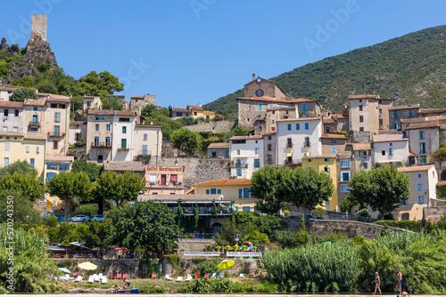 Obraz premium Vue estivale sur le village de Roquebrun depuis les berges de l'Orb