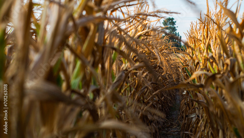 © Anthony, Fototapeta premium Vue rapprochée de maïs d'élevage, flétri en fin de période estivale