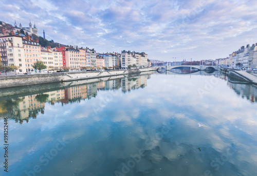Naklejka premium vue sur le vieux Lyon et la colline de Fourvière du côté du quartier Saint Georges avec la Saône au premier plan