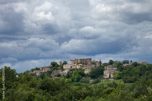 © Hervé Rouveure, Fototapeta premium Vue sur le village perché d'Autichamp (Drôme) sous un ciel nuageux