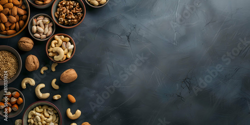 Naklejka premium vue verticale d'un assortiment de fruits et fruit secs sur un plan de travail dans une cuisine, espace pour texte