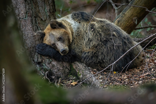 Fototapeta premium Vulnerable brown bear, ursus arctos, lying near the tree in autumn. Curled...