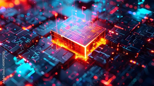 Obraz premium Vulnerable 3D Firewall Surrounded by Bright Digital Indicators