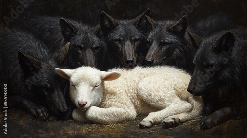 Fototapeta premium Vulnerable Lamb Amidst Menacing Wolves