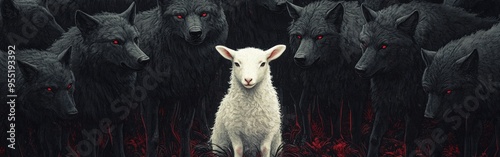 Fototapeta premium Vulnerable Lamb Amidst Menacing Wolves