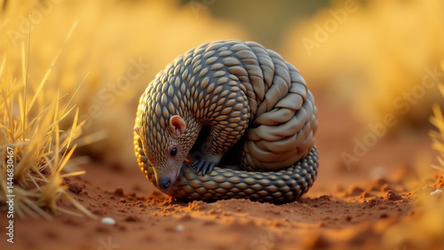 Fototapeta premium Vulnerable Moment: Pangolin Mid-Curl in Grassland