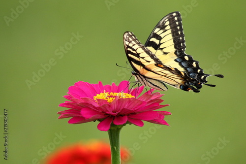 © Melody Mellinger, Obraz premium W ciepłe letnie popołudnie w moim ogrodzie motyl paziowatych wschodni żywi się dziedzicznymi kwiatami cynii.