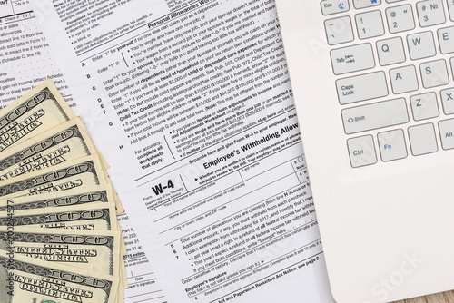 Naklejka premium W-4 form with money and personal computer