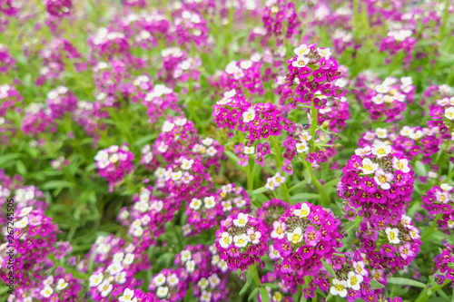 Naklejka premium W ogrodzie rosną okrągłe fioletowe kwiaty składające się z małych kwiatów