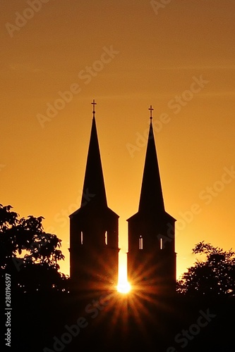 Fototapeta premium Würzburg, Sonnenuntergang hinter der Schottenkirche