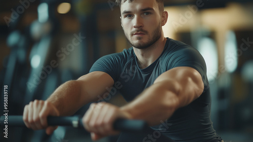 © Sawyer0, Naklejka premium W siłowni, członek klubu fitness ciężko pracuje na maszynie wioślarskiej, wykonując rytmiczne ruchy, które angażują całe ciało.