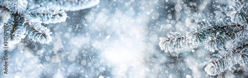 © weyo, Obraz premium W śnieżnej atmosferze szron pokrywały gałęzie sosny. Zimowy panoramiczny baner z ośnieżonymi gałęziami sosny