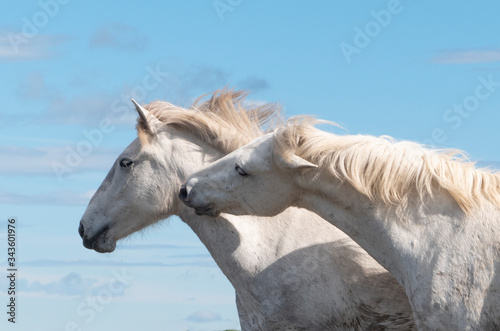 © FrederiqueTEZIER, Obraz premium W stawie bawi się stado klaczy białych koni Camargue