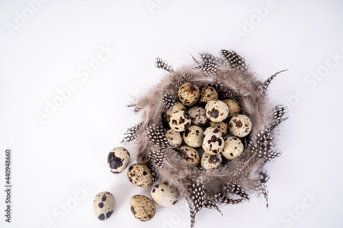 © larissa210777, Obraz premium Wachteleier im Federkörbchen