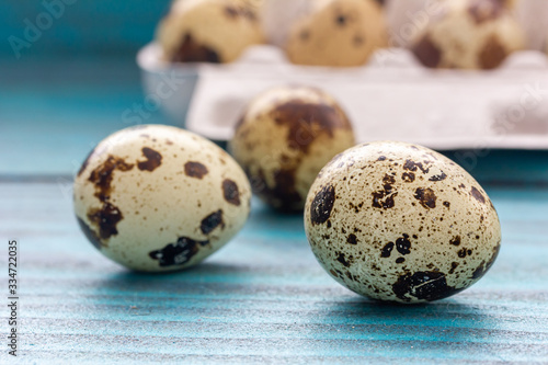Fototapeta premium Wachteleier in einer Eierbox vor Holzhintergrund in Blau