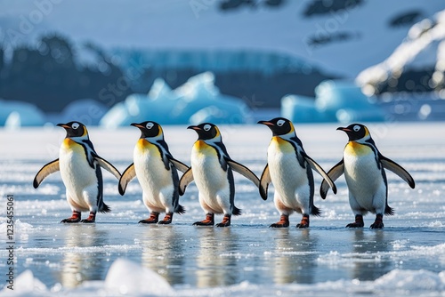© Michael, Obraz premium Waddling Penguins Playing on Ice in a Winter Wonderland