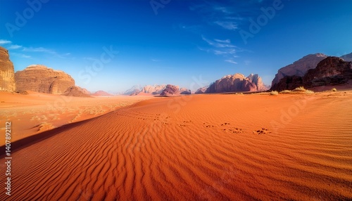 © Dina, Naklejka premium wadi rum s vibrant red sands with clear blue sky a captivating landscape showcasing the unique desert terrain and striking color contrast