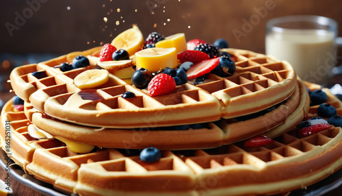 Fototapeta premium Waffle Frenzy: The Exciting Burst of Delicious Waffles in a Flavorful Chaos,...