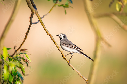 Naklejka premium Wagtail with a worm in its beak sitting on a branch in summer.