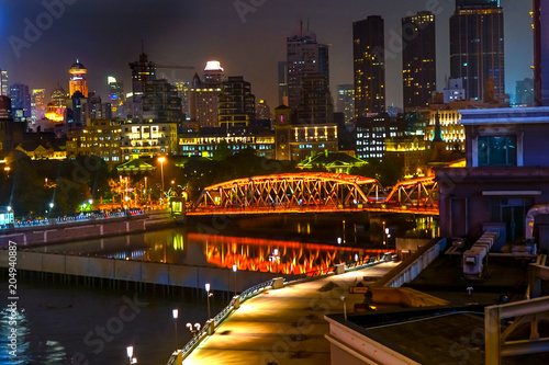 © Bill Perry, Fototapeta premium Waibaidu Bridge Skyscrapers Bund Night Lights Shanghai China
