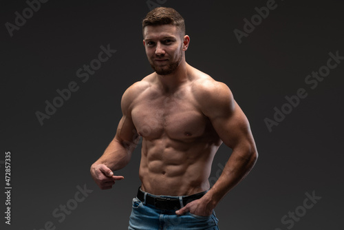 © speed300, Fototapeta premium Waist up portrait of bearded shirtless bodybuilder looking at the camera while posing over the black wall. Stock photo
