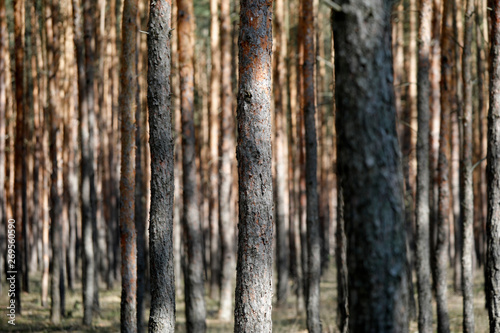 Obraz premium Wald aus Kiefern mit vielen Bäumen Baumstämmen